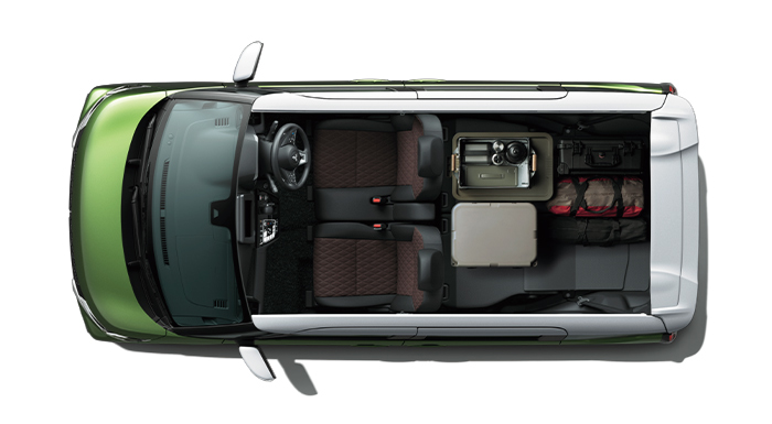 後席のレバーを操作するだけで簡単に荷室がさらに広がります。クーラーボックスなど、かさばるキャンプ道具も余裕で積載。