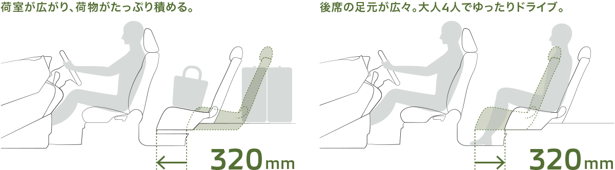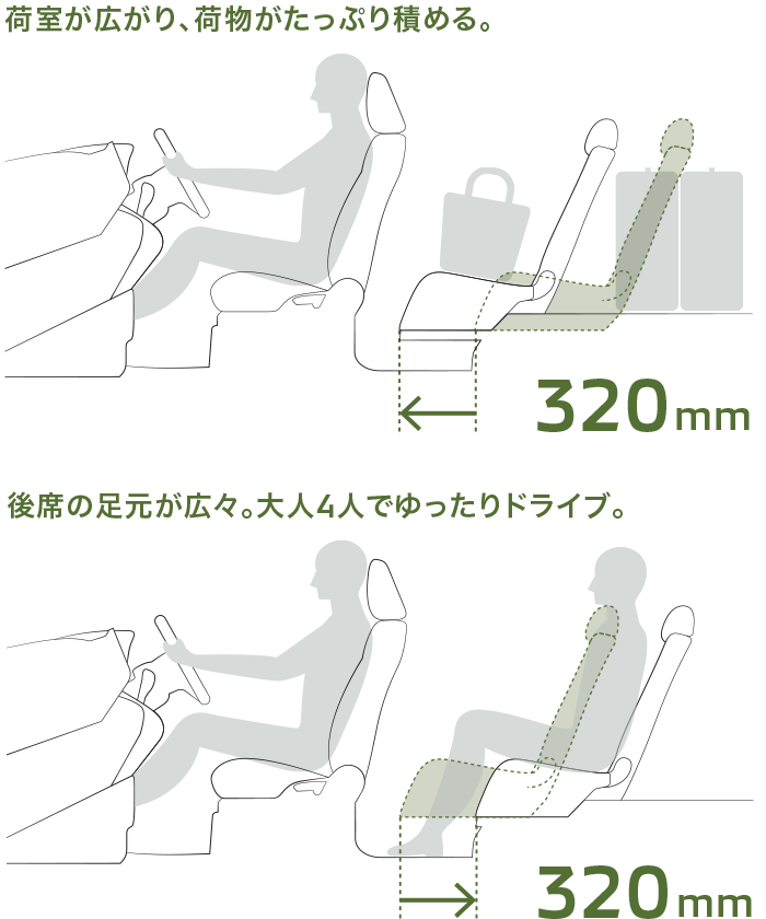 後席は320mmものスライド量を実現。荷物が多いときは、後席を前方にスライドさせれば荷室が広がり、アウトドア用品など荷物をたくさん載せられます。また、後席を後方にスライドすると後席の足元はさらに広々。ゆったりくつろぎながら、ドライブを満喫できます。