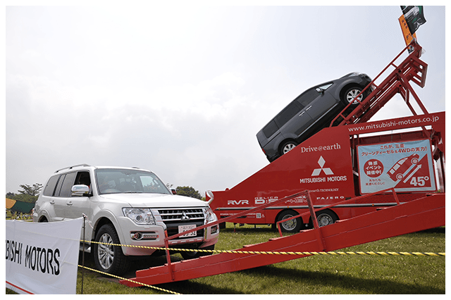 傾斜のついた障害物や、急勾配を駆け上がる4WDキットコース。モーグル路、キャンバー路などオフロードの険しい道を再現した当コースでは、「パジェロ」「デリカD:5」の高い機動力と悪路走破性を体感してもらいました。