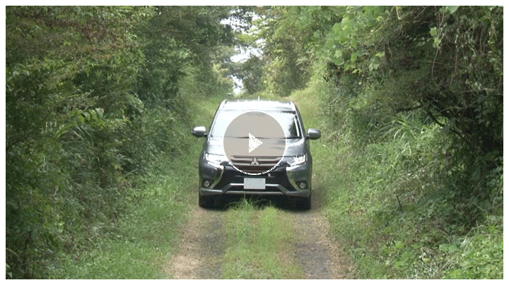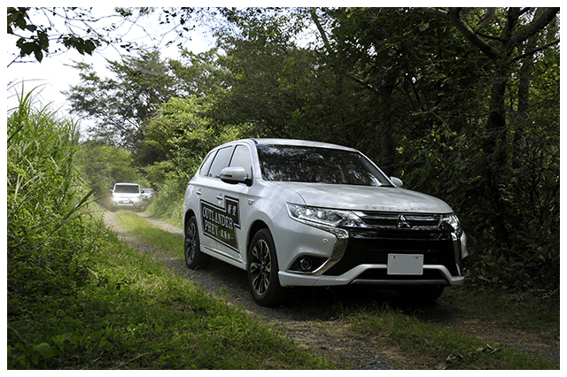 ぬかるみ状になった轍や道幅が狭く滑りやすいカーブなど、自然豊かでワイルドな難路が特徴的な林道コース。この試乗コースでは、グリップしづらい路面でも、思い通りのハンドル操作で安定した走行ができる「アウトランダーPHEV」ならではの走りを体感してもらいました。低重心でカーブも抜群の安定感。