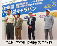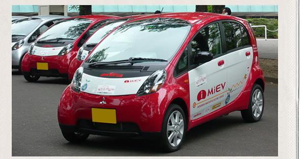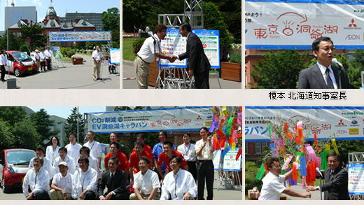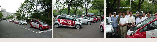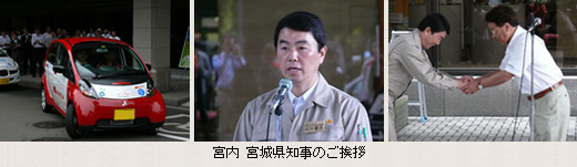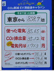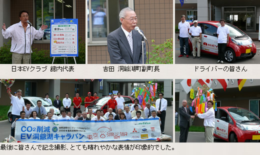 イオンSCよりここまでドライバーを担当した片岡さんと熊野さんに花束が贈呈され、十分実用域まで来ていている感想を述べられました。また日本EVクラブ舘内代表が挨拶と、電気自動車の現在、そして未来について説明、各車ともドライバーのエコドライブも手伝って、予想を超えた走行距離が出ていることなどを報告しました。