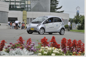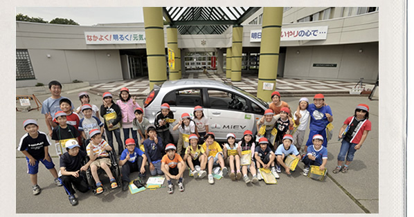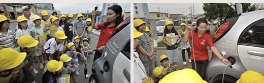 続いて「i MiEV」を小学校内の敷地で同乗試乗、参加した全生徒が試乗し「静かで、匂いもしない!」「ウチのクルマも早くこんなクルマになってほしい」と感想を喋ってくれました。 「i MiEV」には給油口の代わりにコンセントがあり、家庭の100V、あるいは200Vのどちらの電源でも充電できるほか、電力会社等で開発中の急速充電器を使えば短時間で充電できます。