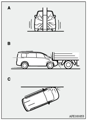 表示 説明 A 電柱や立木など狭い範囲に衝突したとき B トラックなどの荷台へ潜り込んだとき C 斜め前方から衝突したとき