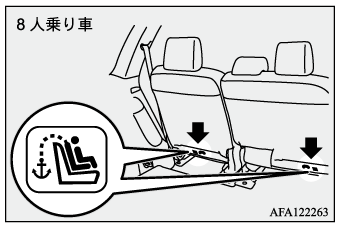 サードシート:調整のしかた - 8人乗り車のセカンドシート右側席(④)にチャイルドシートを取り付けたときは、セカンドシート中央席(③)に座らないでください。チャイルドシートがシートベルトに干渉するため、シートベルトが正しく着用できません。