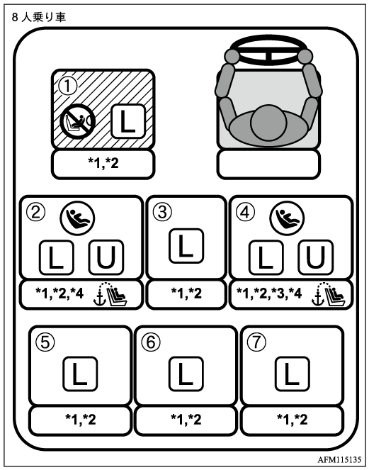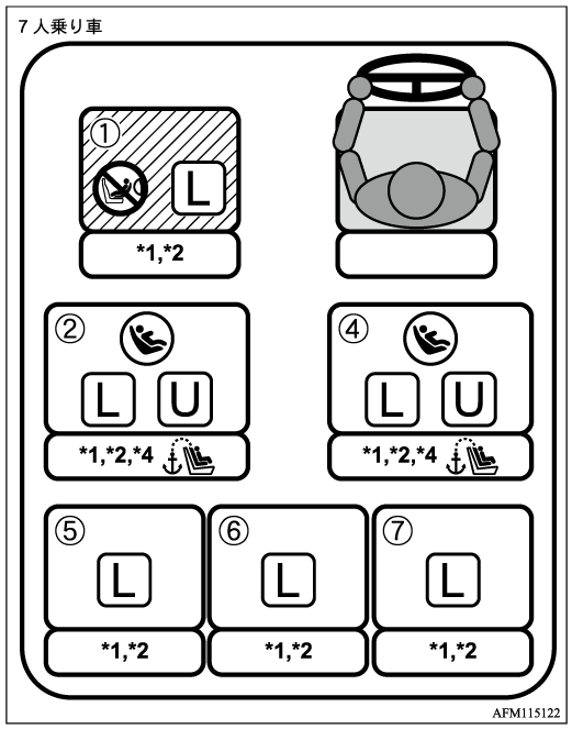 | シート位置の番号 | ①助手席 | セカンドシート | サードシート | ||||
