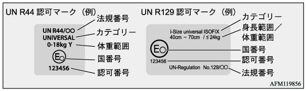 UN R44またはR129はチャイルドシートに関する国際法です。UN R44またはR129に適合したチャイルドシートには、次の認可マークが表示されています。