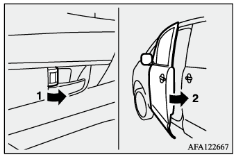 ドア内側のロックノブを車両前方に倒し(1)、ドアを閉じます(2)。