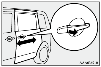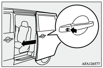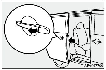 - 電動スライドドアが開閉作動しているときは、車内のドアハンドルを車両前方または後方のどちらに動かしても、電動スライドドアが反転作動します。