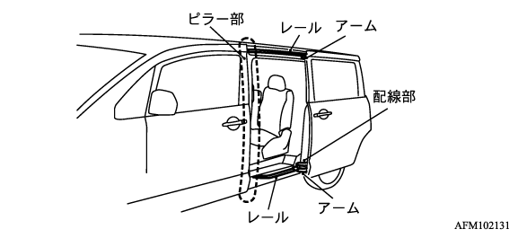 スライドドア本体、レール、アーム、ピラー部または配線部に手や足などを掛けないでください。