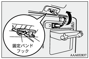 固定バンドの面ファスナーをはがしてから、固定バンドフックを引き上げて固定バンドを緩めます。