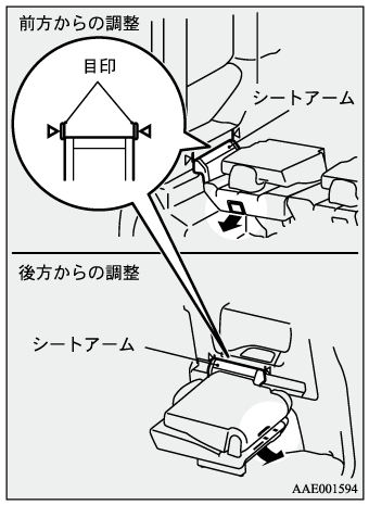 - シートを跳ね上げるときは、前後調整をしないでください。元に戻すときシートの脚が確実に固定されません。