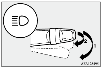- ライトスイッチの位置に関係なく、レバーを(2)まで軽く引いている間ヘッドライトが上向きで点灯します。