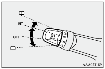 リヤワイパーは自動的に作動した後、レバー先端のツマミがOFF位置にあれば停止し、INT位置にあれば間欠作動に戻ります。