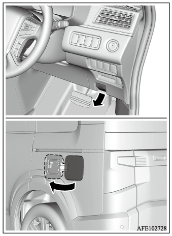 - 助手席側のスライドドアが開いているときは、フューエルリッド(燃料補給口)を開けないでください。スライドドアにフューエルリッドが当たり、傷または汚れをつけるおそれがあります。