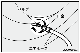 空気を入れすぎたときは、エアホースの口金を緩めて空気を抜きます。- タイヤが膨らむとき、タイヤとホイールの間に指などはさまないようにしてください。