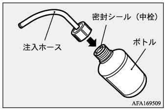 応急修理剤の密封シール(中栓)を付けたまま注入ホースをボトルにねじ込みます。注入ホースをねじ込むと、密封シール(中栓)が破れ、修理剤が注入できる状態になります。