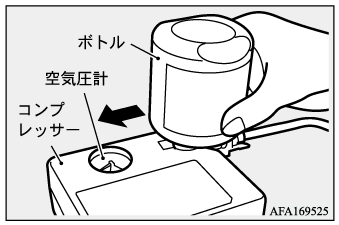 空気圧計を上にしてコンプレッサーを置き、コンプレッサーに応急修理剤のボトルを差し込みます。