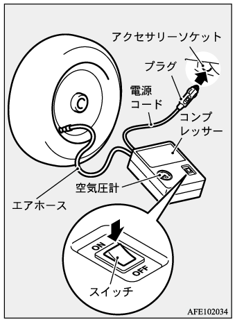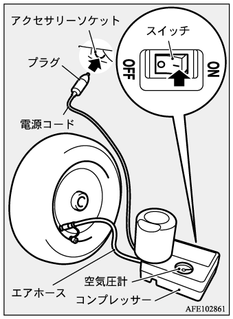 - 備え付けのコンプレッサーは、自動車用タイヤの空気充填用です。自動車用タイヤの空気充填や空気圧の点検以外での利用はしないでください。