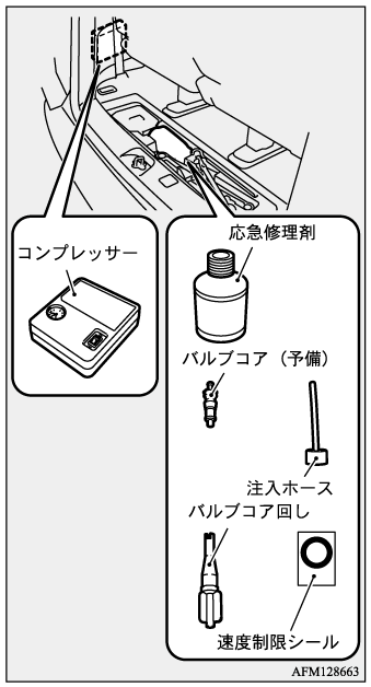 - 空気圧が最少空気圧(130kPa{1.3kgf/cm2})より低下しているときは、応急修理剤での応急修理はできません。