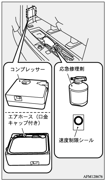 - 応急修理キットで応急修理を行うときは、車を地面が平らで安全な場所に止めてください。