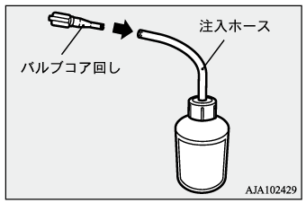 注入が終わった空ボトルから修理剤が漏れるのを防ぐため、注入ホースの先端にバルブコア回しを差し込んで栓をします。