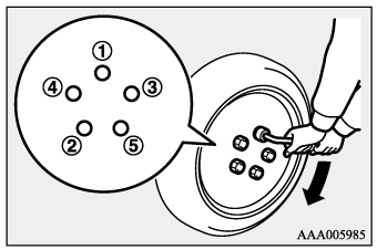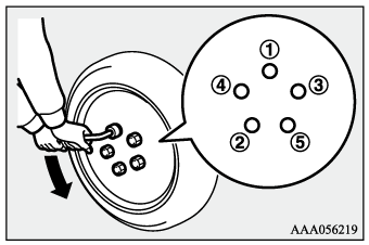 ホイールナットレンチを使用して、ホイールナットを番号順に、手で回るくらいまで緩めます。