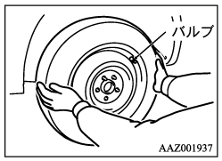 タイヤを取り付けるときは、タイヤの裏表に注意し、バルブが車体外側を向くように取り付けてください。取り付けた際、バルブが見えなければ、タイヤが裏向きに取り付けられています。
