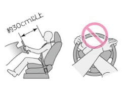 SRSエアバッグ格納部に身体を近づけない。また、内がけでのハンドル操作はしない。