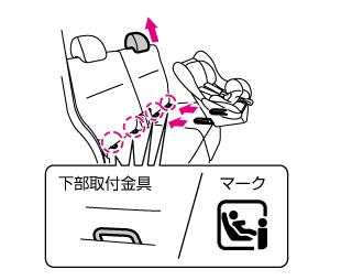 ヘッドレストを外して(ヘッドレストとチャイルドシートが干渉してチャイルドシートを正しく取り付けられない場合)、チャイルドシートを座席に置き、チャイルドシートに付属の取扱説明書に従って下部取付金具に固定します。