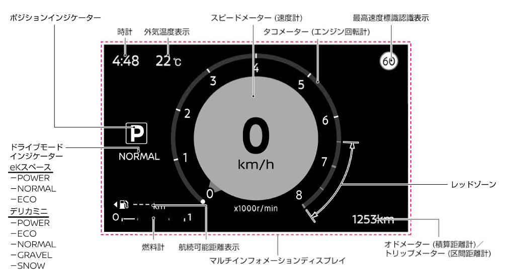 キースイッチ(電源ポジション)をONにすると、計器類が表示されます。