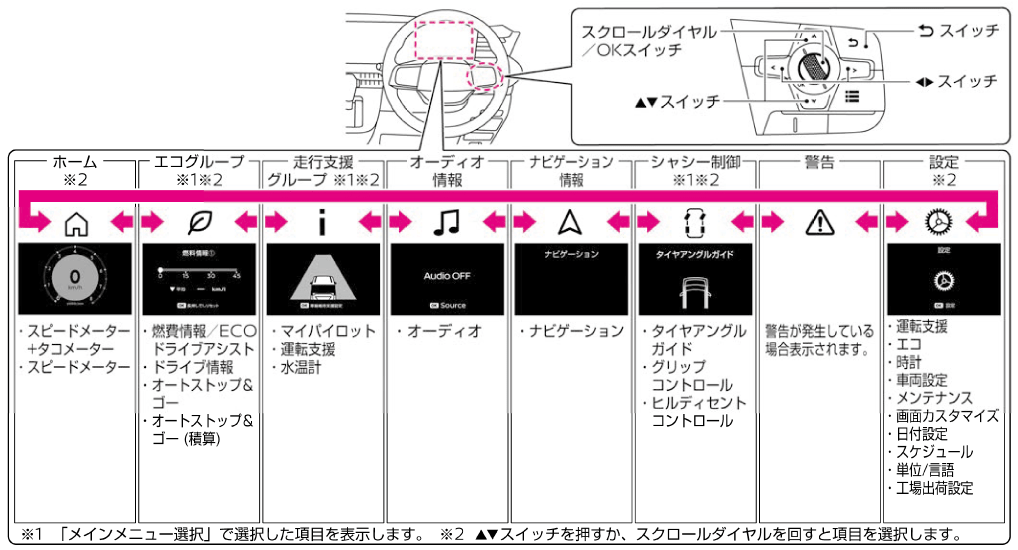 >スイッチを押すと、ホーム、エコグループ、走行支援グループ、オーディオ情報★、ナビゲーション情報★、シャシー制御、警告、設定の順で表示項目が切り替わります。車種により表示できる項目が異なる場合があります。