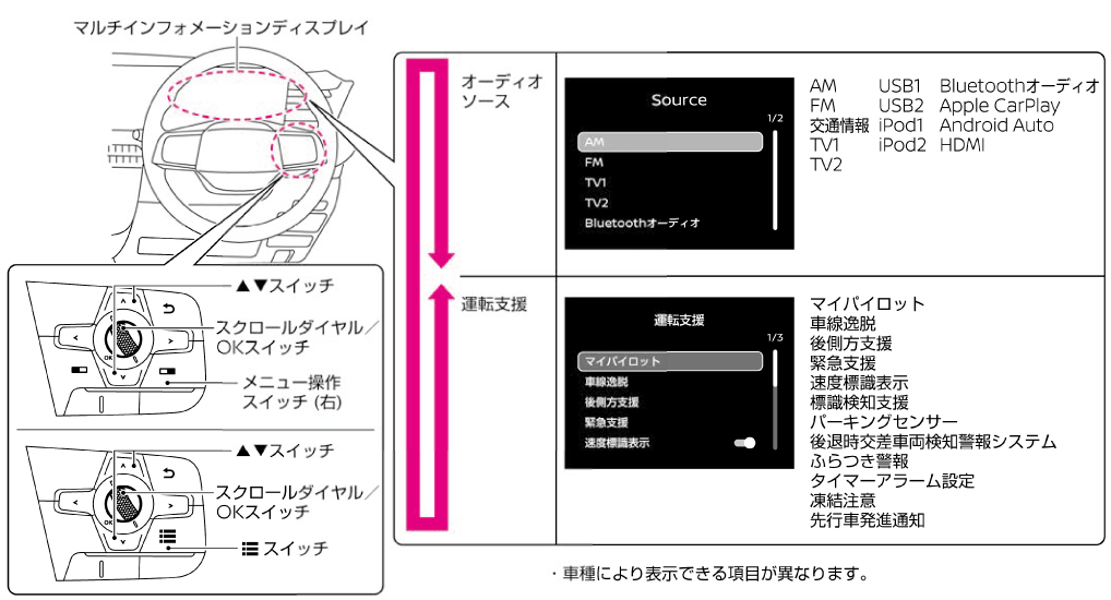 >スイッチを押すと、よく使用する設定項目画面をすばやく表示することができます。オーディオソース、運転支援のいずれかの表示項目を選択できます。