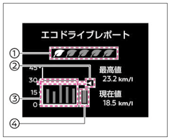 - マルチインフォメーションディスプレイで[設定]⇒[エコ]⇒[エコ情報設定]⇒[エコドライブレポート]を選択すると、エコドライブレポートの表示・非表示を切り替えることができます。