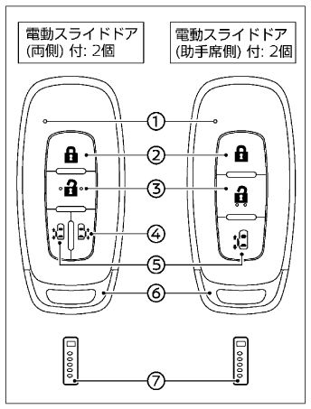 キーを携帯するだけでドアの施錠・解錠、スライドドアの開閉およびエンジンの始動操作ができます。ドアの施錠・解錠のしかたは(ドア)、スライドドアの開閉のしかたは(電動スライドドア★)、始動操作は(エンジンスイッチ(キーレスオペレーションシステム付車))をお読みください。