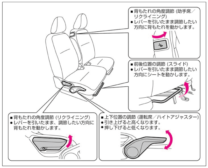 走行中に調節すると、思わぬ事故につながるおそれがあります。 - シートを調節したあとは、確実に固定されたことを確認する。