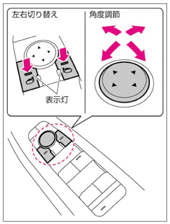 (スイッチの表示灯が点灯) - <角度調節スイッチ>を前後左右に押して、鏡面角度を調節します。