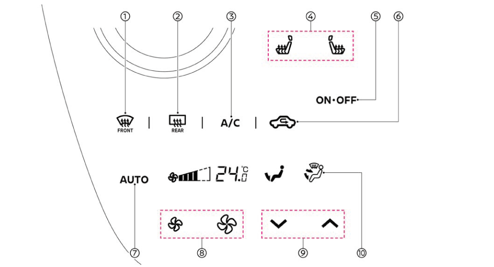 - 送風で使用すると、冷房、暖房、除湿機能が作動せず、ファンのみがまわって車室内の空気を循環させます。
