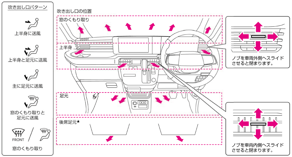 吹き出し口切り替えスイッチまたはデフロスタースイッチをタッチするごとに吹き出し口が切り替わります。