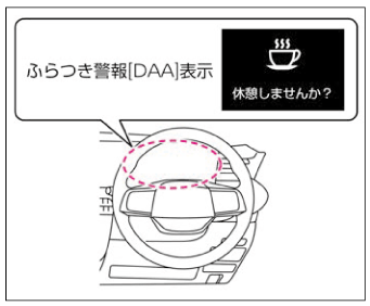 DAAは、ハンドル操作から運転者の注意力が低下していると判断したときに、マルチインフォメーションディスプレイの表示と音により運転者に休憩を促します。