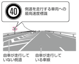 自車の路線に対しての標識ではないが、自車の路線付近にあり、その標識が自車の路線に向いている場合(本線から分岐する側道の一時停止標識や最高速度標識など)