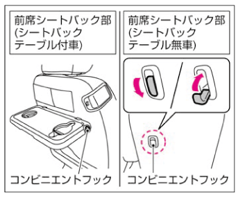 - 前席シートバック部のフック(シートバックテーブル付車)はシートバックテーブル使用時に使用できます。