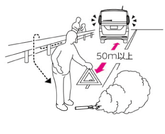 同乗者をガードレールの外側などに避難させ、車両の50m以上後方に発炎筒と停止表示板(停止表示灯)を置きます。