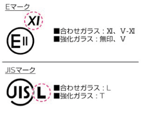 ドアガラスには次のような刻印(マーク)が表示されています。この表示によって、合わせガラスかどうかを見分けることができます。