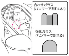 - フロントウインドウガラスは合わせガラスのため、緊急脱出用ハンマーで割ることはできません。フロントドアガラス、リヤドアガラス、テールゲートガラスを割って脱出してください。
