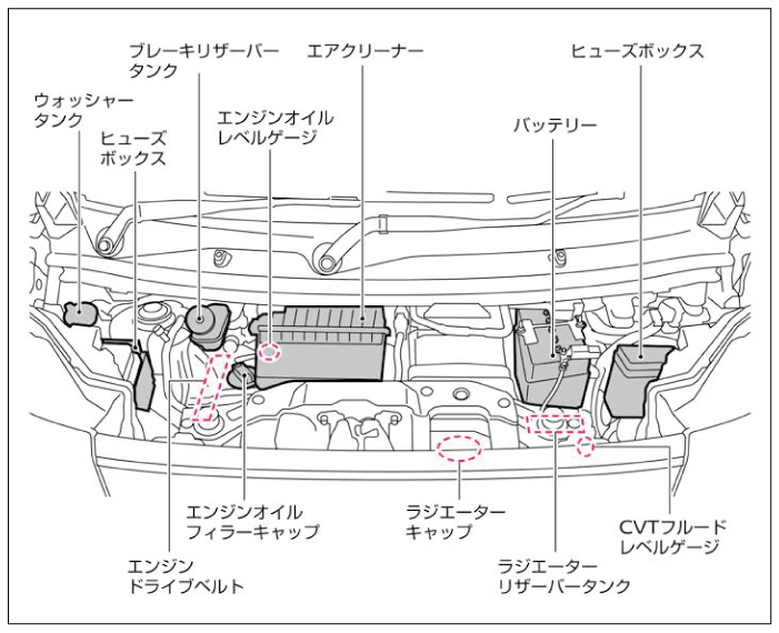 エンジンルーム内を点検するときは安全な場所に停車し、パーキングブレーキをかけた状態でボンネットを開けます。