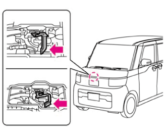 - ボンネットを閉めるときに、ボンネットに体重をかけて強い力で押すと、ボンネットがへこむおそれがあります。