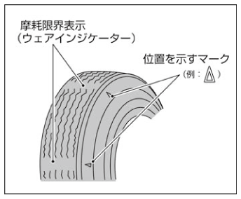 タイヤの溝の深さが十分であるか、ウェアインジケーター(摩耗限界表示)が表れていないか点検してください。