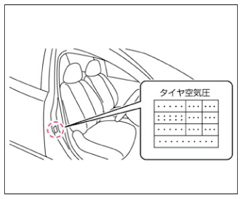 タイヤの指定空気圧は運転席ドアの開口部に表示してあるため、確認してください。