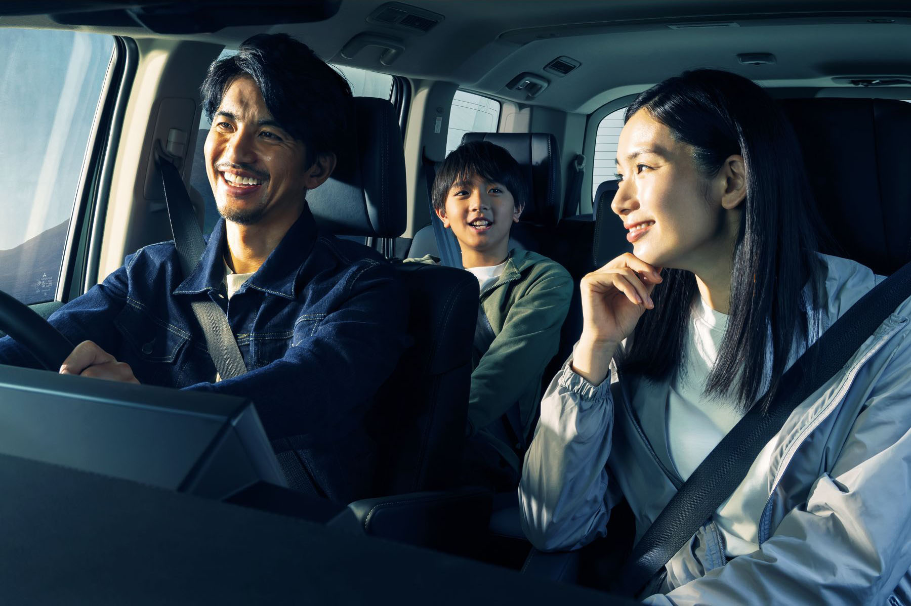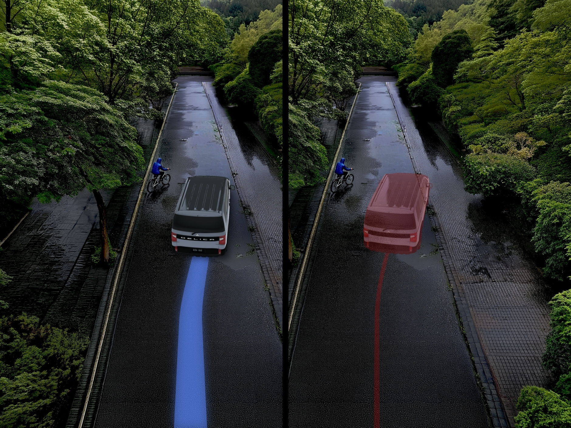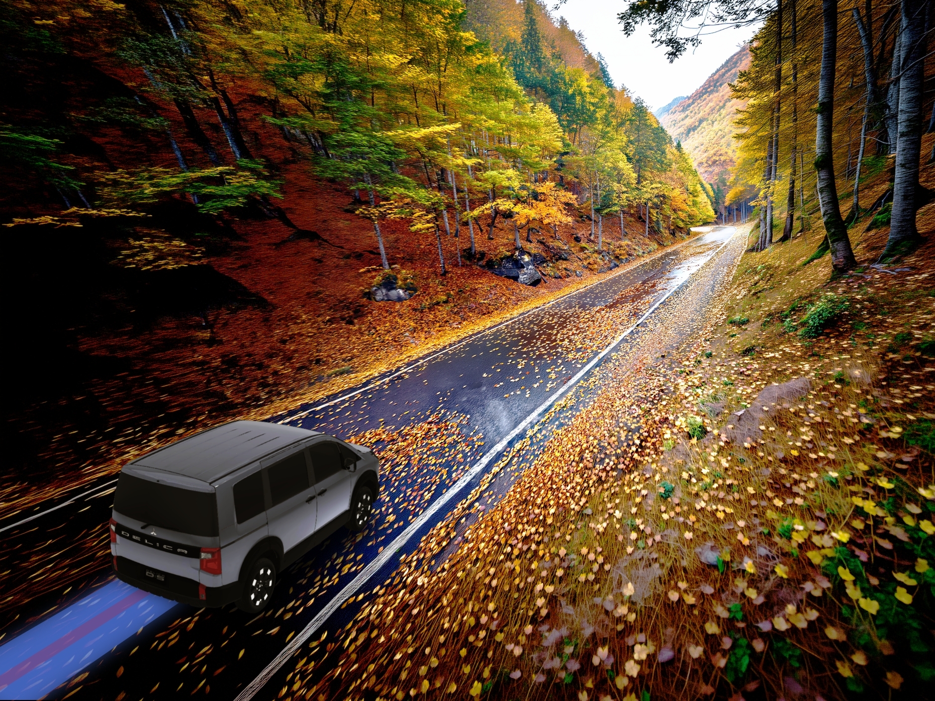 デリカは4つのタイヤそれぞれの力を調整しながら走ってくれるんだ。例えば横風に煽られてふらついた時は、タイヤに少しブレーキをかけて、風に逆らう動きをさせるんだって。