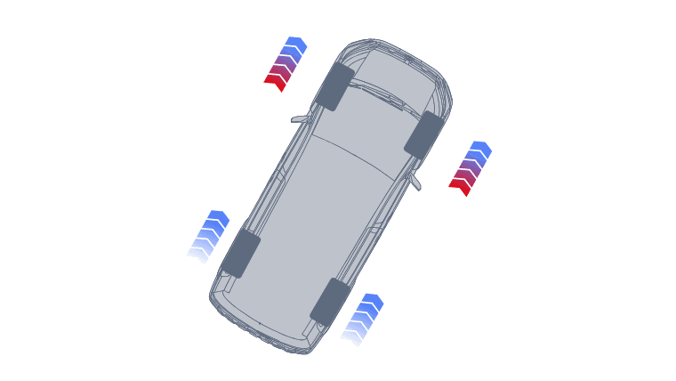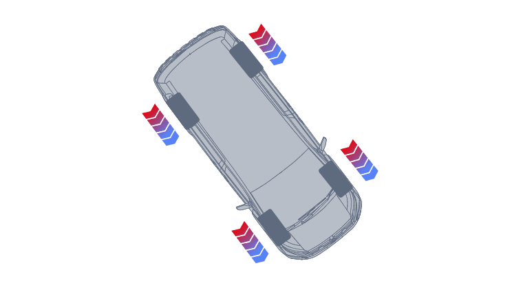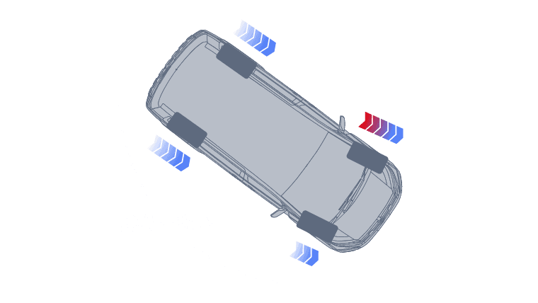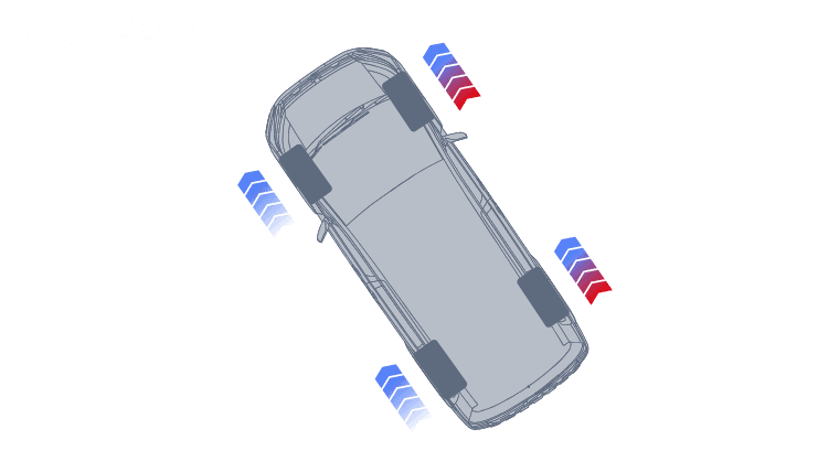 ハンドルを切った際、カーブ内側のタイヤにだけブレーキをわずかにかけるAYCを採用しています。内側が軸となり走行できることで、車体が外に膨らむ(アンダーステア)のを防ぎ、頭がカックンとならないスムーズな旋回を生みだします。